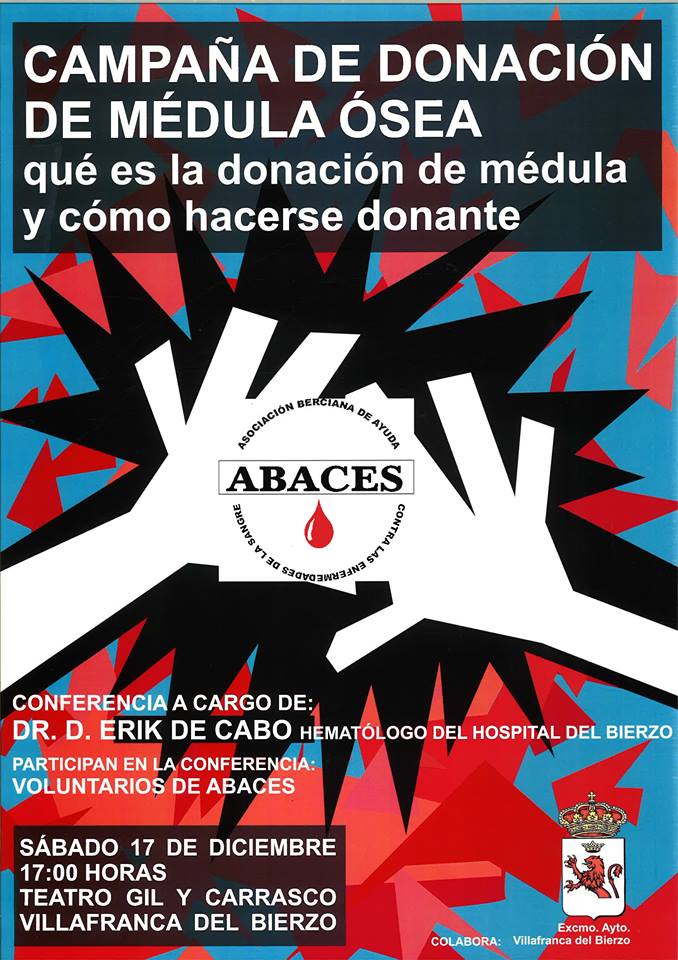 Conferencia a cargo del Dr. Erik de Cabo, hematólogo del Hospital del Bierzo, dentro de la campaña de donación de médula ósea, que se realizará en el Teatro Villafraquino Enrique Gil y Carrasco el Sábado 17 de Diciembre a las 17:00 horas. Organiza la Asociación ABACES (Asociación Berciana de Ayuda contra las enfermedades de la sangre) colabora el Ayuntamiento de Villafranca del Bierzo.