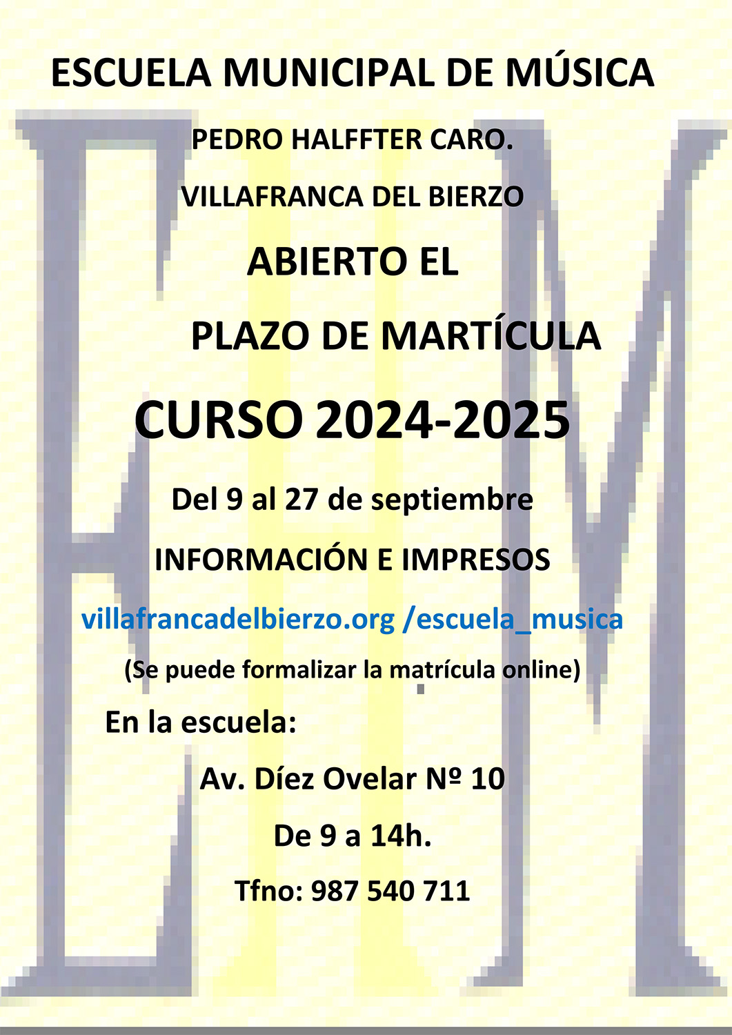 También puedes realizar la matrícula en la Escuela de Música en horario de 09:00 a 14:00 horas, de lunes a viernes. En este mismo horario se podrá pedir información en el teléfono 987 54 07 11.